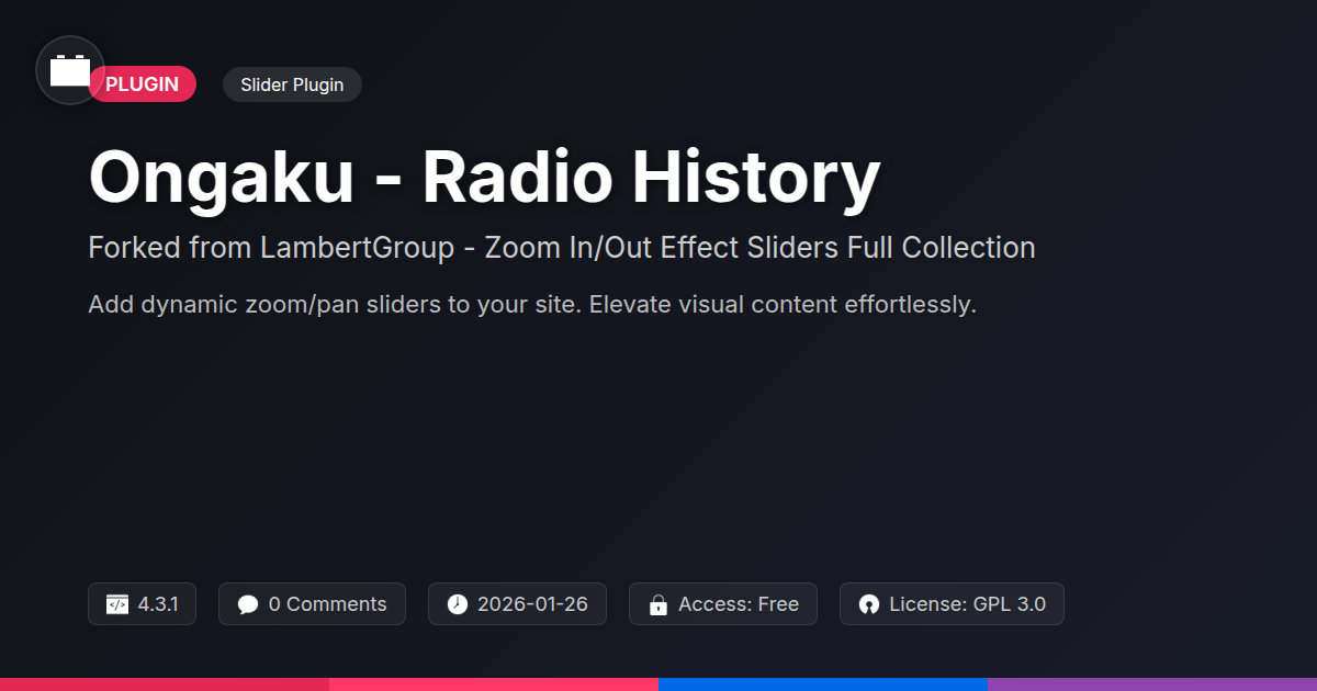So, are you tired of your website's visuals playing the same old tune? Does the thought of adding dynamic flair send shivers of debugging dread down your spine? We get it. The quest for scroll-triggered animations that actually work and perform beautifully can feel like searching for a needle in a haystack – a very slow, janky haystack. But what if that needle is actually a finely tuned instrument, ready to orchestrate a symphony of visual engagement on your site? Ongaku - Radio History, born from a robust heritage of slider expertise, offers precisely that. It's the evolution you've been waiting for, a carefully forked and enhanced solution that brings sophisticated zoom and pan effects within your grasp. This isn't just about making images move; it's about telling stories, guiding user attention, and creating immersive experiences that resonate. Developed with the discerning eye of coders, agencies, and open-source aficionados in mind, it strikes that magical balance between powerful functionality and elegant simplicity. You get granular control over every aspect of the animation – speed, direction, timing – without wrestling with convoluted code or facing performance bottlenecks. It’s a testament to what happens when a solid foundation is thoughtfully iterated upon, prioritizing both aesthetic impact and technical integrity. Stop settling for static, and start creating dynamic. Elevate your digital canvas and leave your visitors captivated. It’s time to give your content the captivating soundtrack it deserves.