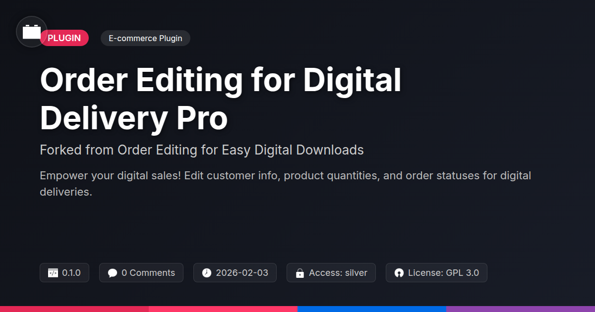 So, there you have it. If you're a developer constantly battling the digital order dragon, an agency trying to keep clients happy with flawless digital deliveries, or an open-source enthusiast who appreciates a well-honed tool, 'Order Editing for Digital Delivery Pro' is your new best friend. We’ve taken a solid, battle-tested foundation and honed it specifically for the nuances of selling digital goods, because let's be honest, selling a downloadable PDF is a slightly different beast than shipping a physical widget. No more late-night debugging sessions trying to patch up a cracked order system. No more awkward customer service calls explaining why you can’t possibly change that one tiny detail. This plugin is your digital order’s guardian angel, here to bring order to chaos and save you from those soul-crushing moments of "Oh no, what have I done?" It’s about giving you the power and flexibility you need to run your digital business like the smooth, efficient operation it deserves to be. So, stop wrestling with the mundane and start focusing on the magnificent. Give your digital sales the professional edge they crave and reclaim your evenings. It’s time to edit your way to e-commerce glory, one impeccably managed digital order at a time.