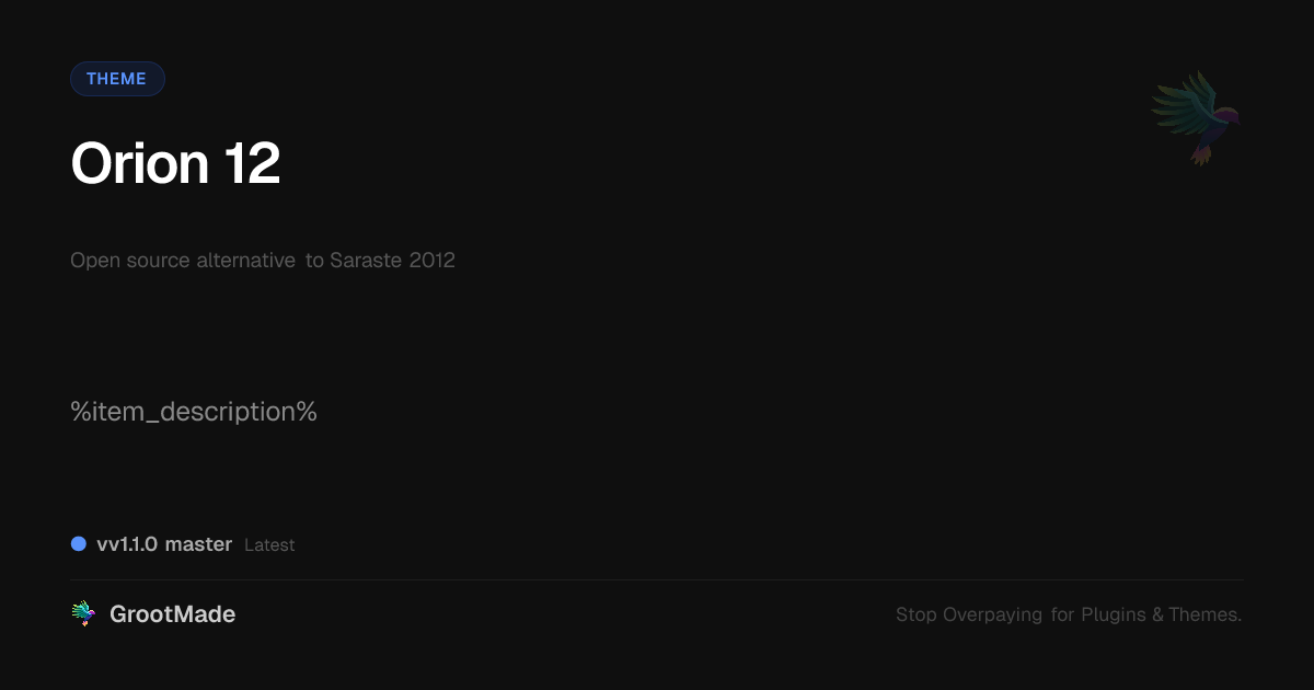 GrootMade is NOT affiliated with Saraste 2012 or its original author. Saraste 2012™ is a trademark of its respective owner and use of it does not imply any endorsement or affiliation. This product has been forked under the GNU General Public License (GPL) and all non-GPL assets (such as proprietary images, fonts, and branding) have been removed. Distributing GPL-licensed code is 100% legal.