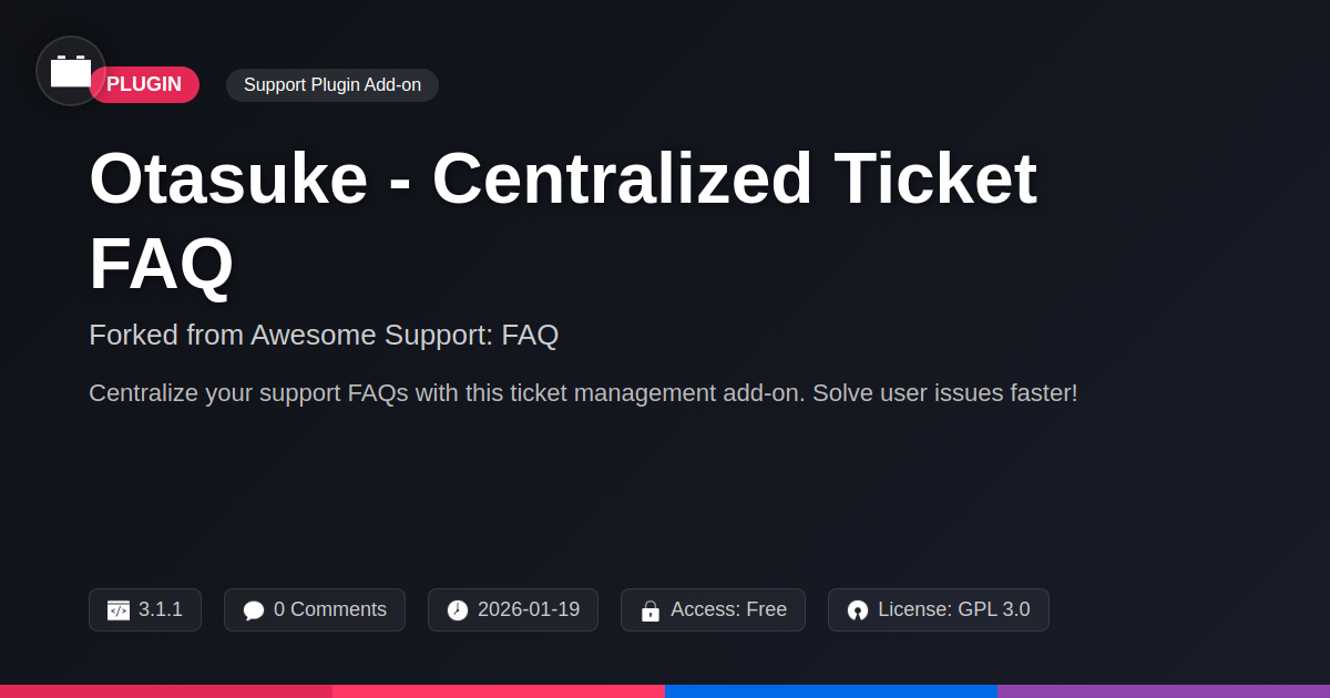 Otasuke - Centralized Ticket FAQ isn't just another plugin; it's your digital peace treaty with your support queue. It's that one thing that allows you to say, 'Have you tried looking here first?' with a smug, yet entirely justified, sense of relief. For developers, agencies, and anyone who appreciates elegant solutions to messy problems, this fork is your new best friend. It’s about reclaiming your precious brain cycles, ensuring your clients (or users) get answers swiftly, and generally making your life a little less like a constant episode of 'Support Ticket Mayhem.'