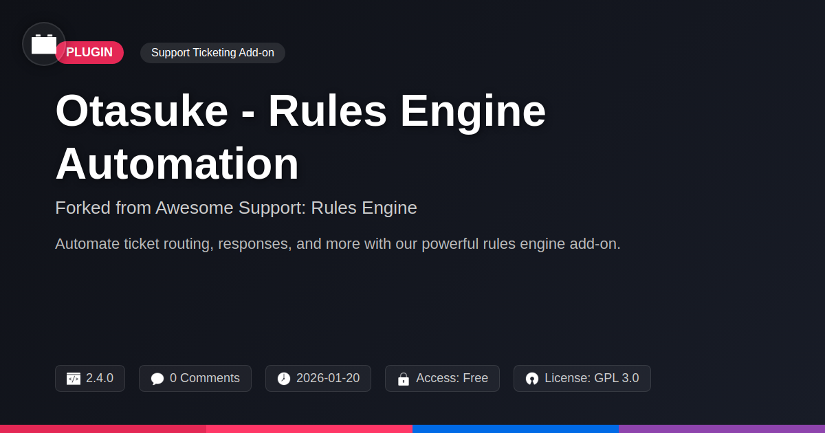 GrootMade is NOT affiliated with Awesome Support: Rules Engine or its original author. Awesome Support: Rules Engine™ is a trademark of its respective owner and use of it does not imply any endorsement or affiliation. This product has been forked under the GNU General Public License (GPL) and all non-GPL assets (such as proprietary images, fonts, and branding) have been removed. Distributing GPL-licensed code is 100% legal.