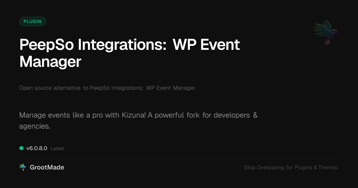 GrootMade is NOT affiliated with PeepSo Integrations: WP Event Manager or its original author. PeepSo Integrations: WP Event Manager™ is a trademark of its respective owner and use of it does not imply any endorsement or affiliation. This product has been forked under the GNU General Public License (GPL) and all non-GPL assets (such as proprietary images, fonts, and branding) have been removed. Distributing GPL-licensed code is 100% legal.