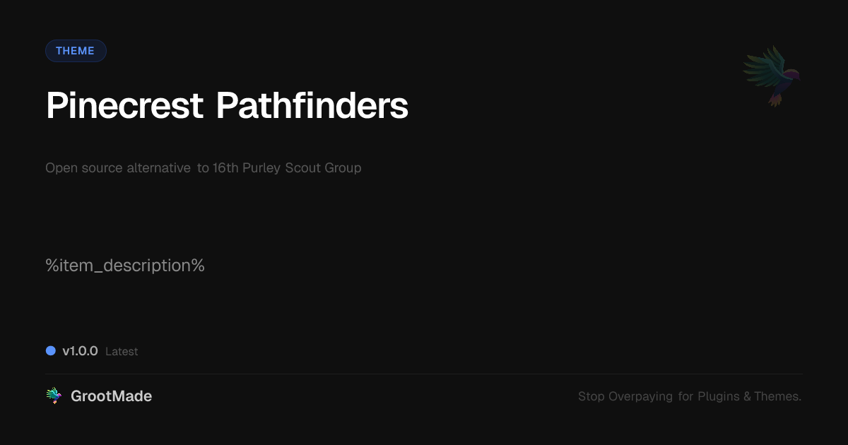 GrootMade is NOT affiliated with 16th Purley Scout Group or its original author. 16th Purley Scout Group™ is a trademark of its respective owner and use of it does not imply any endorsement or affiliation. This product has been forked under the GNU General Public License (GPL) and all non-GPL assets (such as proprietary images, fonts, and branding) have been removed. Distributing GPL-licensed code is 100% legal.