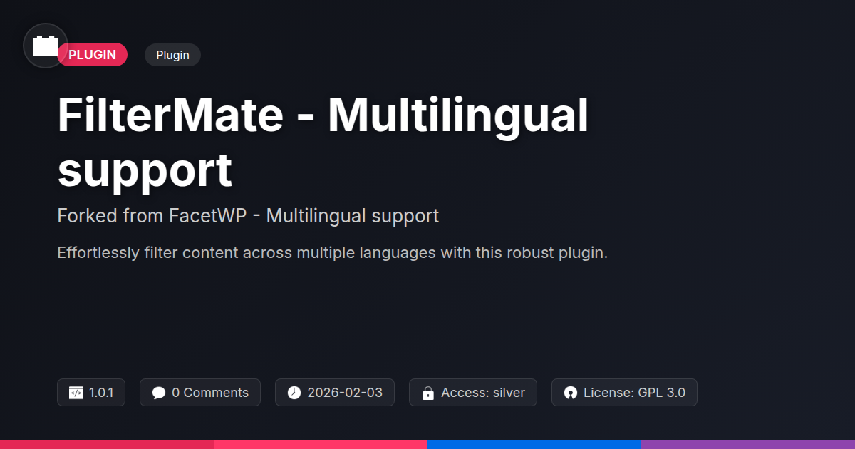 GrootMade is NOT affiliated with FacetWP - Multilingual support or its original author. FacetWP - Multilingual support™ is a trademark of its respective owner and use of it does not imply any endorsement or affiliation. This product has been forked under the GNU General Public License (GPL) and all non-GPL assets (such as proprietary images, fonts, and branding) have been removed. Distributing GPL-licensed code is 100% legal.