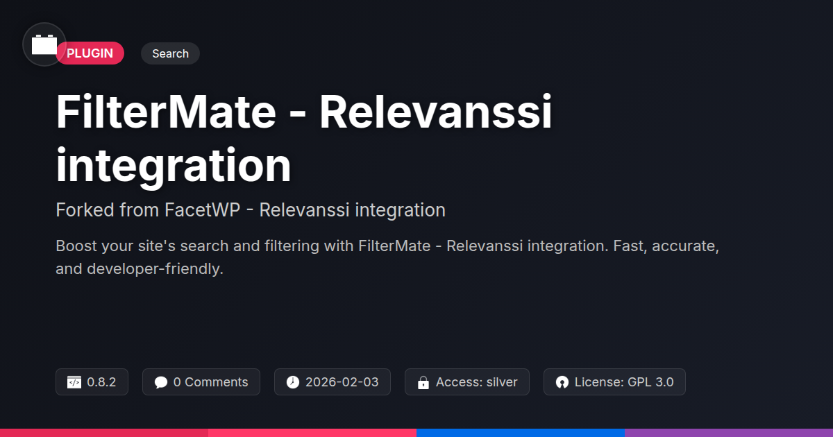 GrootMade is NOT affiliated with FacetWP - Relevanssi integration or its original author. FacetWP - Relevanssi integration™ is a trademark of its respective owner and use of it does not imply any endorsement or affiliation. This product has been forked under the GNU General Public License (GPL) and all non-GPL assets (such as proprietary images, fonts, and branding) have been removed. Distributing GPL-licensed code is 100% legal.