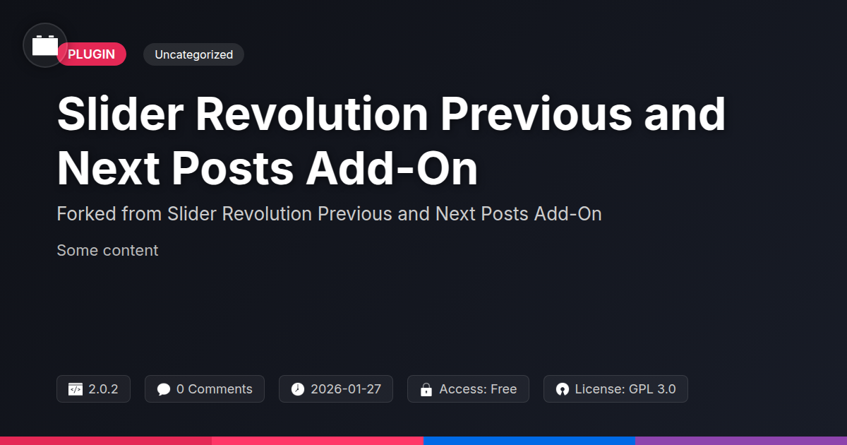 GrootMade is NOT affiliated with Slider Revolution Previous and Next Posts Add-On or its original author. Slider Revolution Previous and Next Posts Add-On™ is a trademark of its respective owner and use of it does not imply any endorsement or affiliation. This product has been forked under the GNU General Public License (GPL) and all non-GPL assets (such as proprietary images, fonts, and branding) have been removed. Distributing GPL-licensed code is 100% legal.