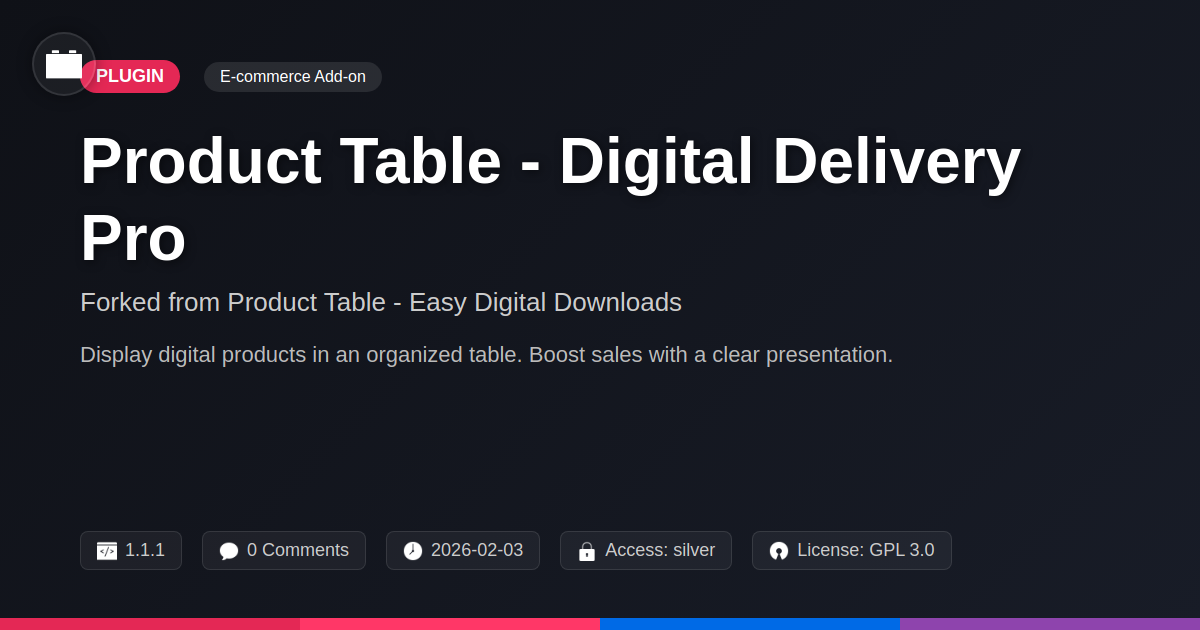 GrootMade is NOT affiliated with Product Table - Easy Digital Downloads or its original author. Product Table - Easy Digital Downloads™ is a trademark of its respective owner and use of it does not imply any endorsement or affiliation. This product has been forked under the GNU General Public License (GPL) and all non-GPL assets (such as proprietary images, fonts, and branding) have been removed. Distributing GPL-licensed code is 100% legal.