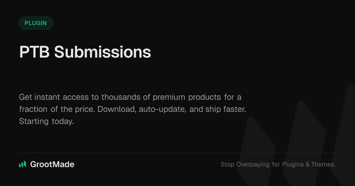 GrootMade is NOT affiliated with PTB Submissions or its original author. PTB Submissions™ is a trademark of its respective owner and use of it does not imply any endorsement or affiliation. This product has been forked under the GNU General Public License (GPL) and all non-GPL assets (such as proprietary images, fonts, and branding) have been removed. Distributing GPL-licensed code is 100% legal.