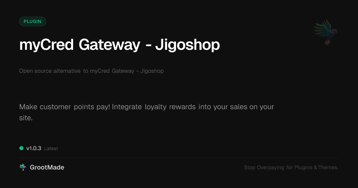 GrootMade is NOT affiliated with myCred Gateway - Jigoshop or its original author. myCred Gateway - Jigoshop™ is a trademark of its respective owner and use of it does not imply any endorsement or affiliation. This product has been forked under the GNU General Public License (GPL) and all non-GPL assets (such as proprietary images, fonts, and branding) have been removed. Distributing GPL-licensed code is 100% legal.