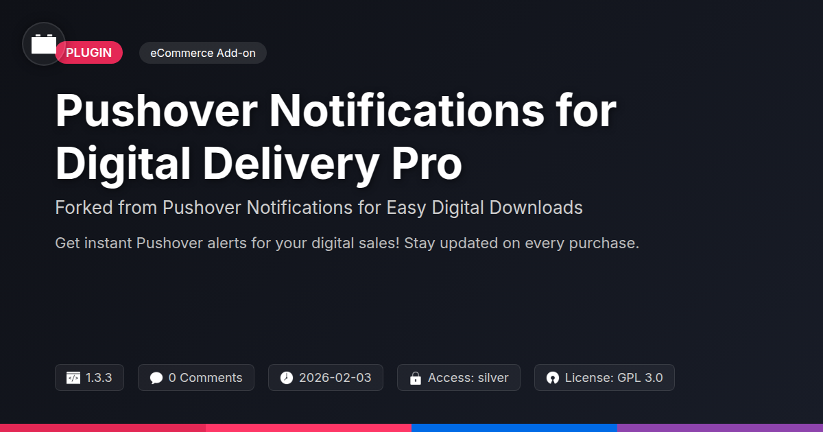GrootMade is NOT affiliated with Pushover Notifications for Easy Digital Downloads or its original author. Pushover Notifications for Easy Digital Downloads™ is a trademark of its respective owner and use of it does not imply any endorsement or affiliation. This product has been forked under the GNU General Public License (GPL) and all non-GPL assets (such as proprietary images, fonts, and branding) have been removed. Distributing GPL-licensed code is 100% legal.