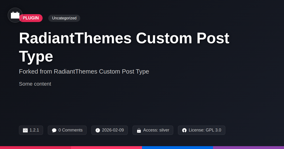 GrootMade is NOT affiliated with RadiantThemes Custom Post Type or its original author. RadiantThemes Custom Post Type™ is a trademark of its respective owner and use of it does not imply any endorsement or affiliation. This product has been forked under the GNU General Public License (GPL) and all non-GPL assets (such as proprietary images, fonts, and branding) have been removed. Distributing GPL-licensed code is 100% legal.
