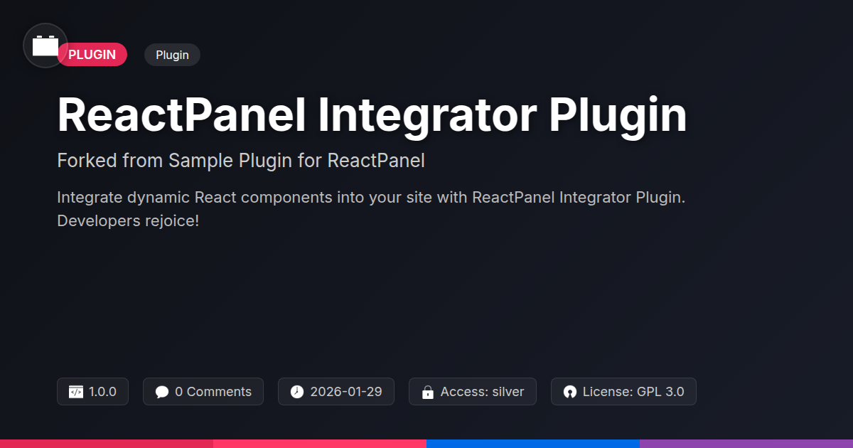 GrootMade is NOT affiliated with Sample Plugin for ReactPanel or its original author. Sample Plugin for ReactPanel™ is a trademark of its respective owner and use of it does not imply any endorsement or affiliation. This product has been forked under the GNU General Public License (GPL) and all non-GPL assets (such as proprietary images, fonts, and branding) have been removed. Distributing GPL-licensed code is 100% legal.