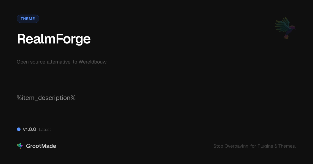 GrootMade is NOT affiliated with Wereldbouw or its original author. Wereldbouw™ is a trademark of its respective owner and use of it does not imply any endorsement or affiliation. This product has been forked under the GNU General Public License (GPL) and all non-GPL assets (such as proprietary images, fonts, and branding) have been removed. Distributing GPL-licensed code is 100% legal.