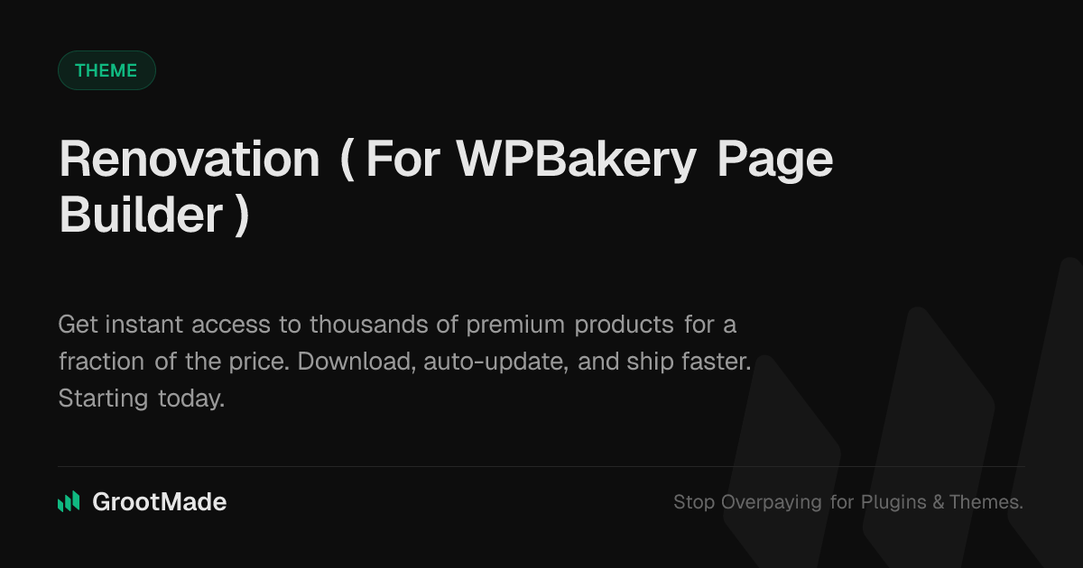 GrootMade is NOT affiliated with Renovation ( For WPBakery Page Builder ) or its original author. Renovation ( For WPBakery Page Builder )™ is a trademark of its respective owner and use of it does not imply any endorsement or affiliation. This product has been forked under the GNU General Public License (GPL) and all non-GPL assets (such as proprietary images, fonts, and branding) have been removed. Distributing GPL-licensed code is 100% legal.