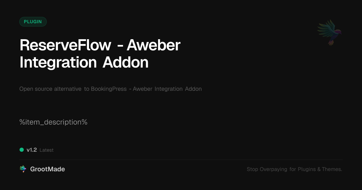 GrootMade is NOT affiliated with BookingPress - Aweber Integration Addon or its original author. BookingPress - Aweber Integration Addon™ is a trademark of its respective owner and use of it does not imply any endorsement or affiliation. This product has been forked under the GNU General Public License (GPL) and all non-GPL assets (such as proprietary images, fonts, and branding) have been removed. Distributing GPL-licensed code is 100% legal.