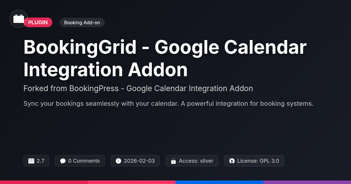 GrootMade is NOT affiliated with BookingPress - Google Calendar Integration Addon or its original author. BookingPress - Google Calendar Integration Addon™ is a trademark of its respective owner and use of it does not imply any endorsement or affiliation. This product has been forked under the GNU General Public License (GPL) and all non-GPL assets (such as proprietary images, fonts, and branding) have been removed. Distributing GPL-licensed code is 100% legal.