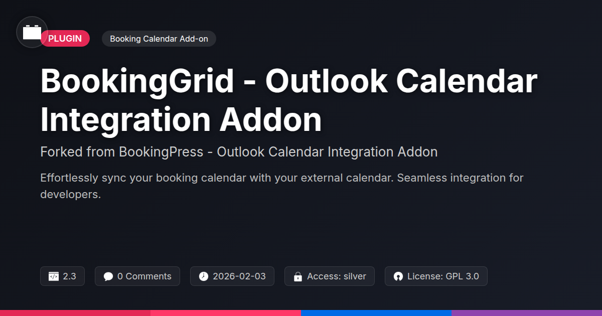 GrootMade is NOT affiliated with BookingPress - Outlook Calendar Integration Addon or its original author. BookingPress - Outlook Calendar Integration Addon™ is a trademark of its respective owner and use of it does not imply any endorsement or affiliation. This product has been forked under the GNU General Public License (GPL) and all non-GPL assets (such as proprietary images, fonts, and branding) have been removed. Distributing GPL-licensed code is 100% legal.