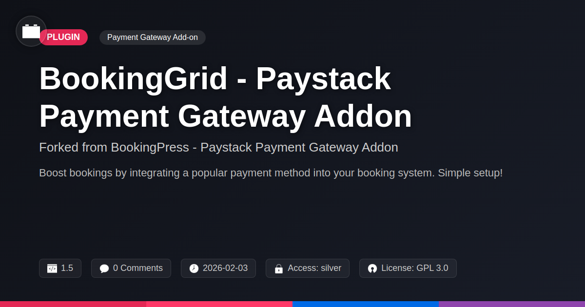 GrootMade is NOT affiliated with BookingPress - Paystack Payment Gateway Addon or its original author. BookingPress - Paystack Payment Gateway Addon™ is a trademark of its respective owner and use of it does not imply any endorsement or affiliation. This product has been forked under the GNU General Public License (GPL) and all non-GPL assets (such as proprietary images, fonts, and branding) have been removed. Distributing GPL-licensed code is 100% legal.