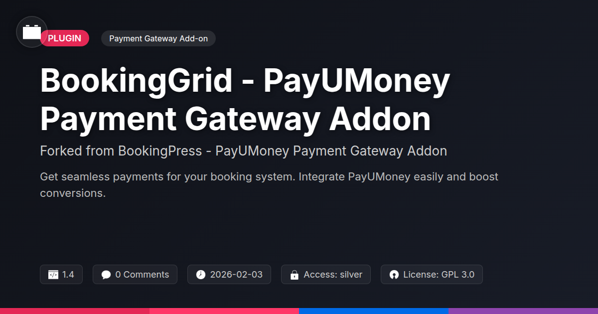 GrootMade is NOT affiliated with BookingPress - PayUMoney Payment Gateway Addon or its original author. BookingPress - PayUMoney Payment Gateway Addon™ is a trademark of its respective owner and use of it does not imply any endorsement or affiliation. This product has been forked under the GNU General Public License (GPL) and all non-GPL assets (such as proprietary images, fonts, and branding) have been removed. Distributing GPL-licensed code is 100% legal.