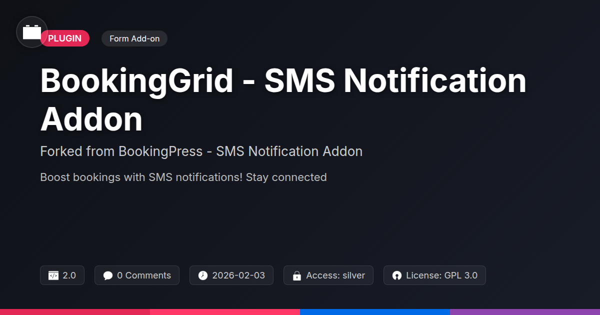 GrootMade is NOT affiliated with BookingPress - SMS Notification Addon or its original author. BookingPress - SMS Notification Addon™ is a trademark of its respective owner and use of it does not imply any endorsement or affiliation. This product has been forked under the GNU General Public License (GPL) and all non-GPL assets (such as proprietary images, fonts, and branding) have been removed. Distributing GPL-licensed code is 100% legal.