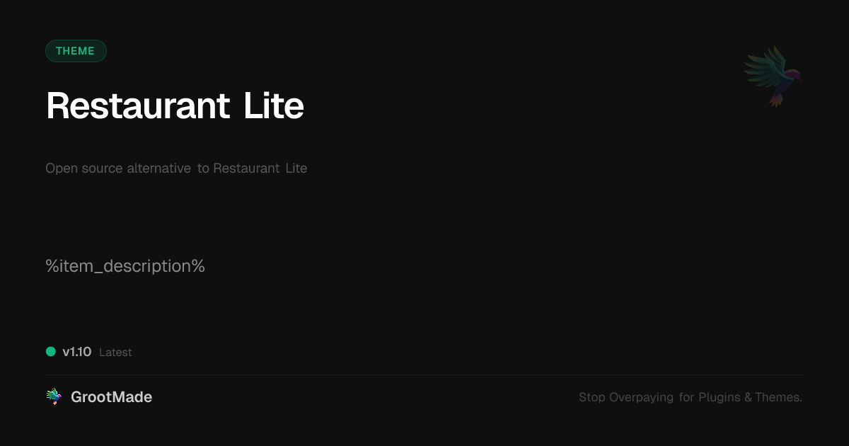GrootMade is NOT affiliated with Restaurant Lite or its original author. Restaurant Lite™ is a trademark of its respective owner and use of it does not imply any endorsement or affiliation. This product has been forked under the GNU General Public License (GPL) and all non-GPL assets (such as proprietary images, fonts, and branding) have been removed. Distributing GPL-licensed code is 100% legal.