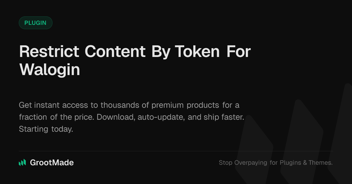 GrootMade is NOT affiliated with Restrict Content By Token For Walogin or its original author. Restrict Content By Token For Walogin™ is a trademark of its respective owner and use of it does not imply any endorsement or affiliation. This product has been forked under the GNU General Public License (GPL) and all non-GPL assets (such as proprietary images, fonts, and branding) have been removed. Distributing GPL-licensed code is 100% legal.