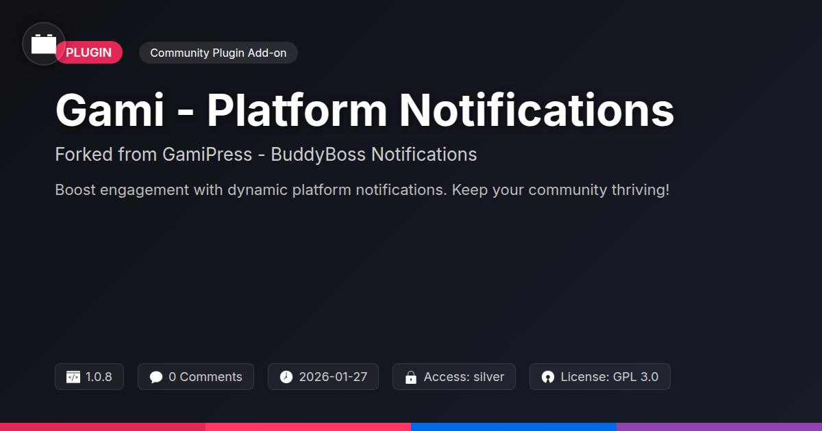 So, there you have it. Is your current platform communication strategy about as effective as shouting your lunch order across a football stadium? Yeah, we thought so. Gami - Platform Notifications is here to rescue you from the silent abyss. By forking from a rock-solid foundation, this isn't just another notification plugin; it's your community's new best friend, its personal hype-man, and its trusty messenger, all rolled into one. For the developers weary of building beautiful digital spaces that feel eerily like empty rooms, and for the agencies tasked with delivering results (read: engaged users who stick around), this tool is your secret weapon. It’s about turning those 'set it and forget it' achievements into genuine moments of celebration, and those planned events into must-attend happenings. Imagine your users not just logging in, but actively participating, responding, and feeling truly connected because they're always in the loop, always aware of what's next. It’s the difference between a static website and a living, breathing community. So, stop whispering into the void and start making some noise. Your community deserves it, and frankly, so do you. Let's get those notifications popping!