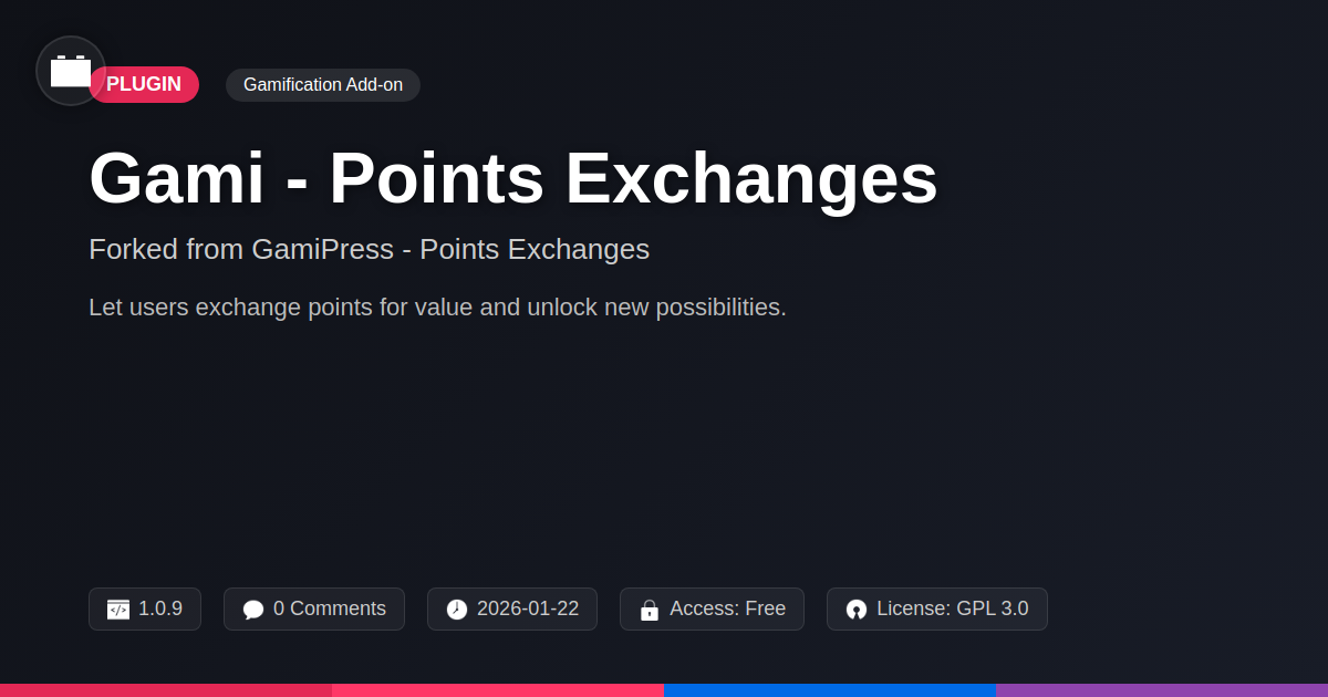 GrootMade is NOT affiliated with GamiPress - Points Exchanges or its original author. GamiPress - Points Exchanges™ is a trademark of its respective owner and use of it does not imply any endorsement or affiliation. This product has been forked under the GNU General Public License (GPL) and all non-GPL assets (such as proprietary images, fonts, and branding) have been removed. Distributing GPL-licensed code is 100% legal.