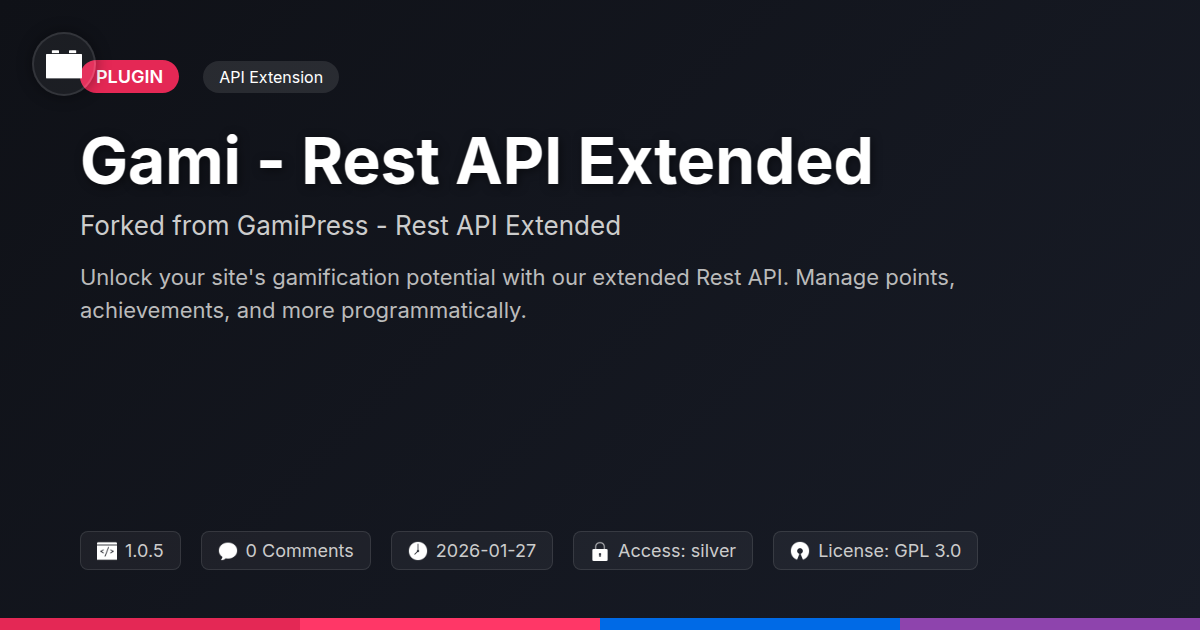 GrootMade is NOT affiliated with GamiPress - Rest API Extended or its original author. GamiPress - Rest API Extended™ is a trademark of its respective owner and use of it does not imply any endorsement or affiliation. This product has been forked under the GNU General Public License (GPL) and all non-GPL assets (such as proprietary images, fonts, and branding) have been removed. Distributing GPL-licensed code is 100% legal.