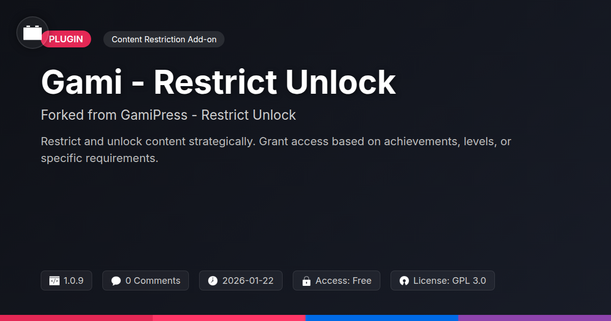 GrootMade is NOT affiliated with GamiPress - Restrict Unlock or its original author. GamiPress - Restrict Unlock™ is a trademark of its respective owner and use of it does not imply any endorsement or affiliation. This product has been forked under the GNU General Public License (GPL) and all non-GPL assets (such as proprietary images, fonts, and branding) have been removed. Distributing GPL-licensed code is 100% legal.