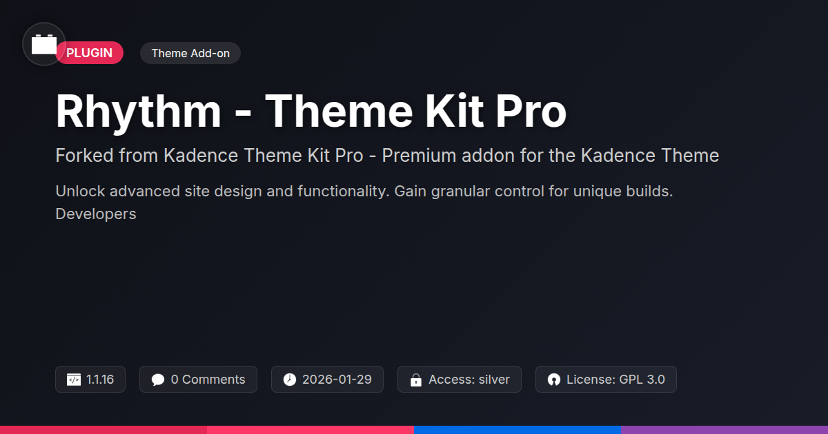 So, there you have it – Rhythm - Theme Kit Pro. If you're a developer who cringes at the thought of repetitive coding, an agency constantly juggling client demands and deadlines, or simply someone who believes your website should be as unique as your fingerprint, this addon is your new best friend. It’s the practical application of pure creative freedom, built on a foundation of solid engineering, and infused with the spirit of open collaboration. We've peeled back the layers to reveal a tool that doesn't just add features; it fundamentally changes how you approach website creation. From crafting intricate custom layouts for any content type to designing headers and footers that truly represent your brand, this kit empowers you to break free from the mundane and build something extraordinary. The days of wrestling with convoluted workarounds or settling for 'good enough' are over. With Rhythm - Theme Kit Pro, you get the power to sculpt, refine, and innovate, all while maintaining an elegant, efficient workflow. It’s an investment in your creativity, your efficiency, and ultimately, the success of your online presence. Ready to stop dreaming and start building?