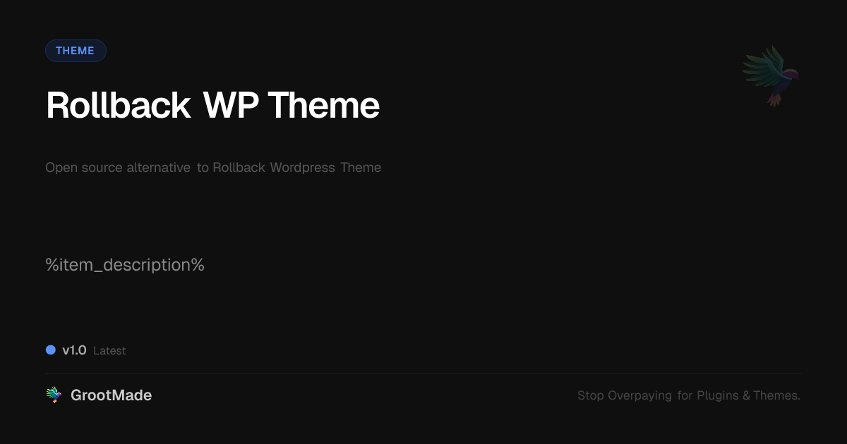 GrootMade is NOT affiliated with Rollback Wordpress Theme or its original author. Rollback Wordpress Theme™ is a trademark of its respective owner and use of it does not imply any endorsement or affiliation. This product has been forked under the GNU General Public License (GPL) and all non-GPL assets (such as proprietary images, fonts, and branding) have been removed. Distributing GPL-licensed code is 100% legal.