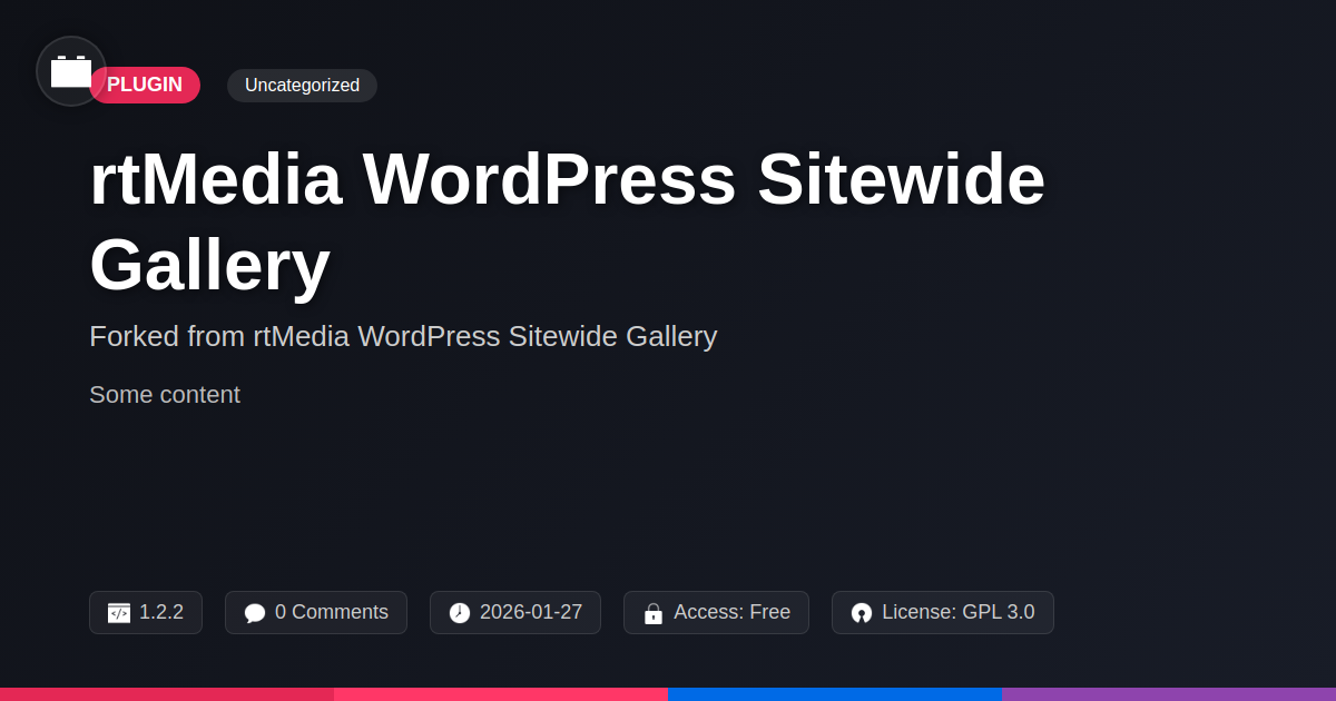 GrootMade is NOT affiliated with rtMedia WordPress Sitewide Gallery or its original author. rtMedia WordPress Sitewide Gallery™ is a trademark of its respective owner and use of it does not imply any endorsement or affiliation. This product has been forked under the GNU General Public License (GPL) and all non-GPL assets (such as proprietary images, fonts, and branding) have been removed. Distributing GPL-licensed code is 100% legal.