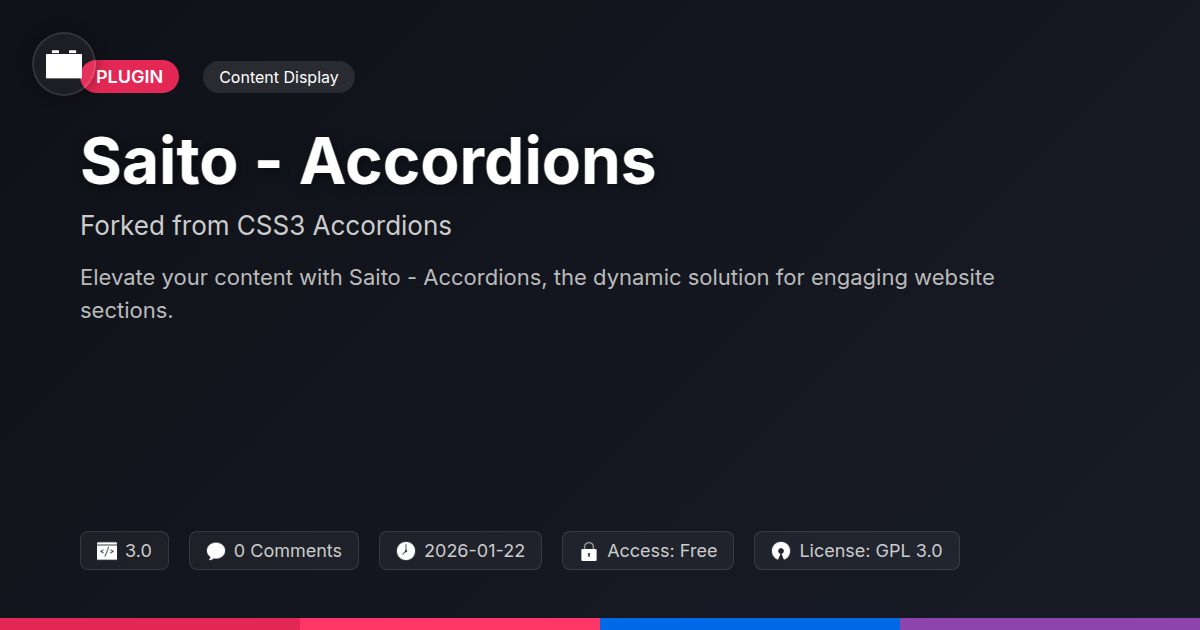 So, there you have it. If your current content strategy resembles a digital hoarder's attic, overflowing with unmanageable information, it's time to call in the organizers. Saito - Accordions isn't just another plugin; it's your newfound ally in the eternal battle against web design disarray. We've seen how it takes your scattered thoughts and transforms them into sleek, expandable sections that users will actually want to engage with. No more fighting with stubborn layouts or wishing for a magic wand to make your content behave. This is the practical, no-nonsense solution that developers and agencies have been clamoring for, a fork from a respected lineage, polished to a shine that would make a show car jealous. Think of the hours saved, the client smiles, and the sheer mental clarity that comes from having a tool that just works. It's about making your website not only look good but also feel intuitive and easy to navigate. Whether you’re showcasing a complex service, building an in-depth FAQ, or just trying to keep your blog posts from looking like Tolstoy’s lesser-known cousin wrote them, Saito - Accordions is ready to unfurl its potential. So, go ahead, give your content the structured elegance it deserves. Your users—and your sanity—will thank you.