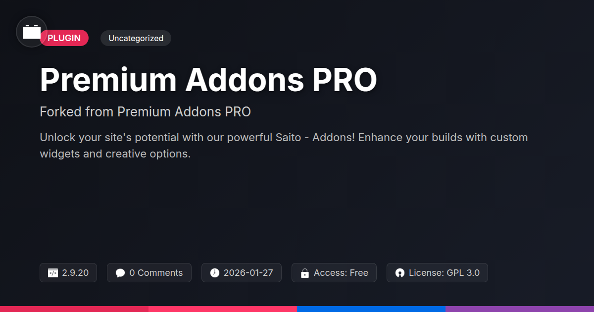 GrootMade is NOT affiliated with Premium Addons PRO or its original author. Premium Addons PRO™ is a trademark of its respective owner and use of it does not imply any endorsement or affiliation. This product has been forked under the GNU General Public License (GPL) and all non-GPL assets (such as proprietary images, fonts, and branding) have been removed. Distributing GPL-licensed code is 100% legal.