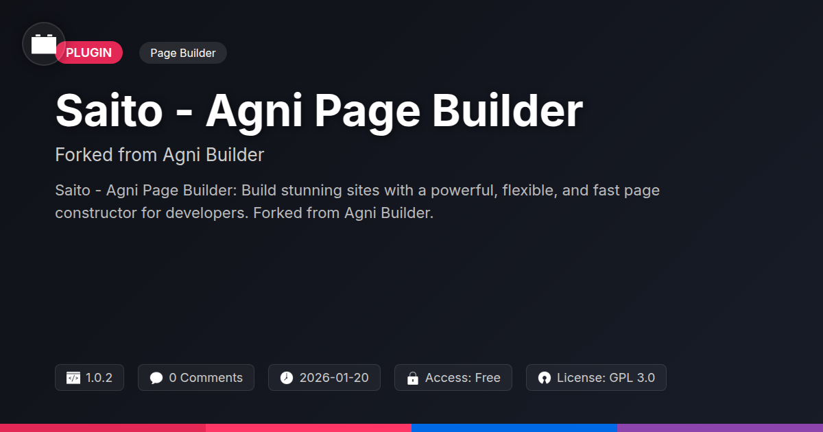 Tired of page builders that feel like wrestling a greased pig in a dark room? Do you dream of visually crafting websites that don't make your clients weep (or your developers scream)? What if you could leverage the power of a proven builder, but with a fresh, community-focused spirit? Saito, a passionate fork of the respected Agni Builder, is here to answer that desperate plea. Forget the bloat, the confusing interfaces, and the endless updates that break everything. We've taken the solid foundation you might already know and love, and injected it with a healthy dose of sanity, speed, and a sprinkle of open-source magic. This isn't just another page builder; it's a curated experience for those who appreciate power without the performance penalty, and flexibility without the existential dread. Whether you're a solo dev looking to slash development time, an agency aiming to impress clients with pixel-perfect designs, or an open-source advocate who believes in the transparency and collaborative spirit of shared tools, Saito is engineered for you. We've streamlined the experience, optimized the performance, and kept the core principles that made its predecessor a favorite. So, ditch the page builder that's been giving you heartburn and prepare to embrace a tool that actually makes website creation enjoyable. Ready to build something awesome, without the usual headaches? Let's dive in.