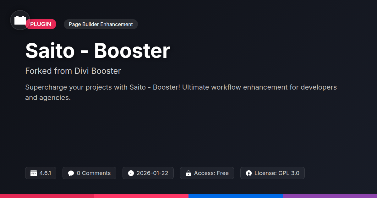 So, there you have it. Saito - Booster isn't just another add-on; it's a rebellion against the mundane, a shout from the rooftops for developers who demand more. You're not here to tick boxes and churn out cookie-cutter websites. You're here to innovate, to build, and to leave your mark. The question isn't if you need a tool that empowers you, but when will you finally ditch the digital drag and embrace something that truly works for you? We've seen the landscape, the constant churn of superficial updates and the ever-present limitations imposed by tools that seem more interested in keeping you contained than setting you free. Saito - Booster is the antithesis of that. It’s about giving you the keys to the kingdom, allowing you to fine-tune, optimize, and customize to your heart's content. Whether you're a solo developer battling tight deadlines or an agency looking to scale your services without breaking the bank, this fork is your digital ally. Remember Dan Mossop's vision: empowering creators. This project carries that torch, fanning the flames of creativity with a robust, community-driven solution. It’s a testament to what can be achieved when functionality, transparency, and a good dose of developer-centric thinking collide. Don't just build websites; craft experiences. Don't just meet requirements; exceed expectations. Embrace the power, embrace the freedom, and let Saito - Booster be the catalyst for your next digital masterpiece. The ball, as they say, is in your court. Make it count.