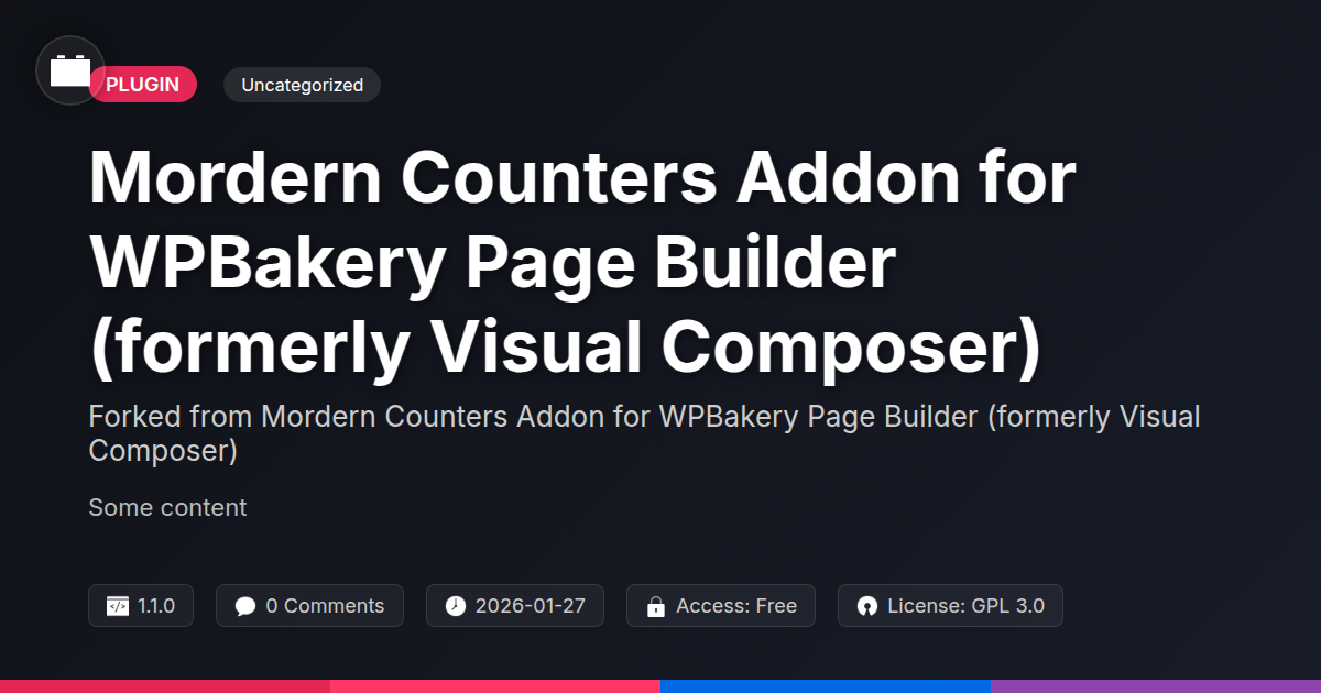 GrootMade is NOT affiliated with Mordern Counters Addon for WPBakery Page Builder (formerly Visual Composer) or its original author. Mordern Counters Addon for WPBakery Page Builder (formerly Visual Composer)™ is a trademark of its respective owner and use of it does not imply any endorsement or affiliation. This product has been forked under the GNU General Public License (GPL) and all non-GPL assets (such as proprietary images, fonts, and branding) have been removed. Distributing GPL-licensed code is 100% legal.