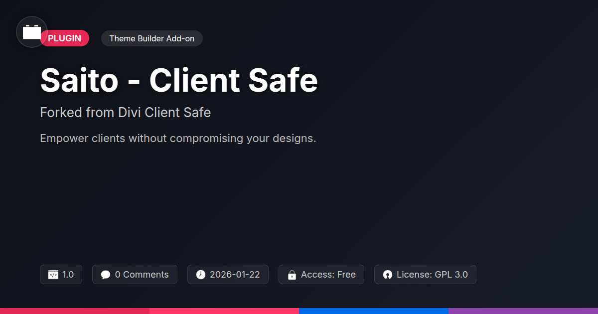 GrootMade is NOT affiliated with Divi Client Safe or its original author. Divi Client Safe™ is a trademark of its respective owner and use of it does not imply any endorsement or affiliation. This product has been forked under the GNU General Public License (GPL) and all non-GPL assets (such as proprietary images, fonts, and branding) have been removed. Distributing GPL-licensed code is 100% legal.