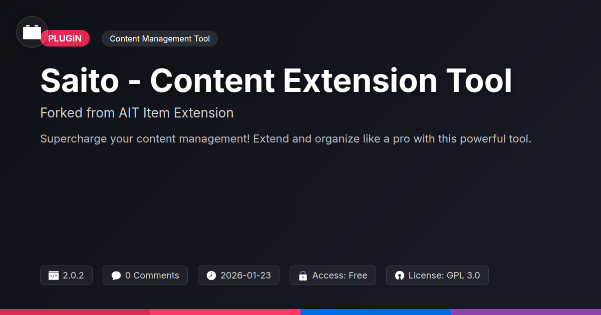 Does the thought of manually wrangling an ever-increasing amount of content make you want to take up competitive thumb-wrestling? For developers and agencies who live and breathe custom solutions, the need for flexible, powerful content management is paramount. We get it. You're not just building websites; you're crafting digital experiences, and sometimes the standard tools feel like trying to paint a mural with a toothpick. That's where Saito - Content Extension Tool swoops in, like a knight in shining (and surprisingly comfortable) armor. Forked from a reliable and battle-tested foundation, Saito takes what was already good and injects it with a shot of pure, unadulterated awesomeness. It’s designed to be the open-source ally you didn't know you desperately needed, empowering you to extend your site's content capabilities beyond the mundane. Forget feature bloat and restrictive templates; Saito is about giving you the reins, allowing you to sculpt your content precisely how you envision it, all while keeping things remarkably efficient and, dare we say, enjoyable. This isn't just another plugin; it's an extension of your own creative power, built for those who demand more from their content.