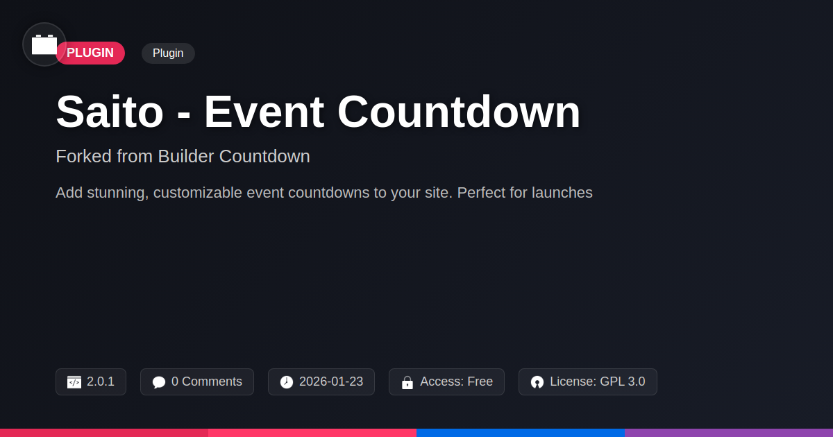 So, there you have it. In a digital landscape cluttered with 'solutions' that promise the world and deliver a slightly damp napkin, Saito - Event Countdown emerges as your beacon of timely brilliance. We’ve taken a proven powerhouse, lovingly forked it, and infused it with the spirit of open-source collaboration, ensuring it remains a flexible, powerful, and, dare we say, fun tool for developers, agencies, and anyone who understands that time, when leveraged correctly, is your most potent marketing weapon. No more wrestling with buggy code, no more settling for templates that scream 'amateur hour.' Saito offers the elegance you crave and the raw power you need to build anticipation, drive conversions, and make your events unforgettable. Whether you're launching a revolutionary new product, running a flash sale that'll make your competitors weep, or simply want to add a touch of urgency to a crucial announcement, Saito has your back. It's built by people who get it, for people who are building amazing things. So, ditch the digital doldrums, embrace the ticking triumph, and let Saito - Event Countdown be the engine that powers your next success. Go forth and time things brilliantly!