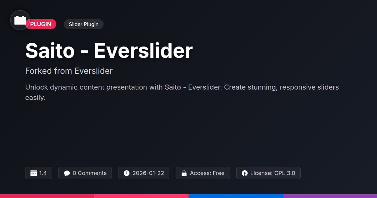 So, there you have it. Saito - Everslider isn't just another slider plugin; it’s a declaration of independence from the shackles of mediocrity. We’ve seen how it offers a beacon of hope for developers and agencies tired of wrestling with plugins that are more trouble than they’re worth. By forking from a solid foundation and embracing the open-source spirit, Saito delivers a robust, flexible, and downright pleasant-to-use solution for bringing your visual content to life. No more compromises, no more soul-crushing limitations. Just pure, unadulterated control over your website's dynamic presentations. Whether you’re looking to captivate your audience with dazzling transitions, ensure your content looks impeccable on every screen, or simply reclaim hours of your valuable development time, Saito - Everslider is your ticket. It’s about empowering you to create, innovate, and shine, without the usual backend headaches. So, if you're ready to ditch the frustration and slide into a more productive, more creative workflow, give Saito - Everslider a spin. Your website, and perhaps your sanity, will thank you for it.