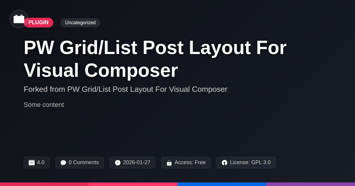 GrootMade is NOT affiliated with PW Grid/List Post Layout For Visual Composer or its original author. PW Grid/List Post Layout For Visual Composer™ is a trademark of its respective owner and use of it does not imply any endorsement or affiliation. This product has been forked under the GNU General Public License (GPL) and all non-GPL assets (such as proprietary images, fonts, and branding) have been removed. Distributing GPL-licensed code is 100% legal.