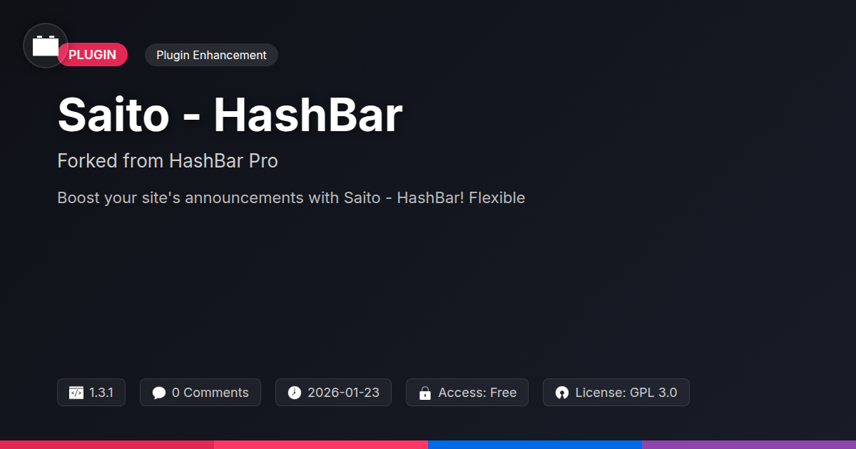 Sick of those bland, ignored banners cluttering your website? You know, the ones that scream "I'm an afterthought" louder than a unmuted gamer during a Zoom call? Well, buckle up, buttercups, because your days of visual mediocrity are numbered. We're talking about Saito - HashBar, a delightful little gem that graciously forked from its commercial parent, bringing a whole lotta power to the open-source party. Think of it as the cool, rebellious cousin who still knows how to rock a killer outfit. For all you pixel-pushing wizards, agency wranglers, and folks who still believe in the magic of community-driven development, this isn't just another plugin; it's a statement. A statement that says, "My website's notifications will be as sharp as my wit and as engaging as a cat video marathon." Forget clunky, one-size-fits-all solutions. Saito - HashBar is here to let you craft announcement bars that don't just inform, but convert. Whether you're shouting about a killer sale, dropping a vital site update, or just trying to subtly nudge users towards your latest masterpiece, this tool is your new best friend. And the best part? It's built with love, for the community, by the community. So, ditch the drab and embrace the fab.