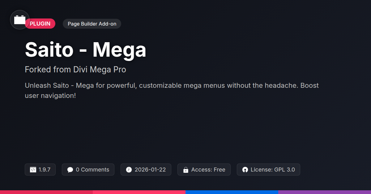 GrootMade is NOT affiliated with Divi Mega Pro or its original author. Divi Mega Pro™ is a trademark of its respective owner and use of it does not imply any endorsement or affiliation. This product has been forked under the GNU General Public License (GPL) and all non-GPL assets (such as proprietary images, fonts, and branding) have been removed. Distributing GPL-licensed code is 100% legal.