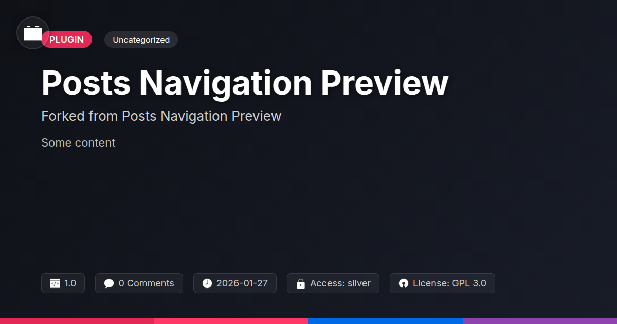 GrootMade is NOT affiliated with Posts Navigation Preview or its original author. Posts Navigation Preview™ is a trademark of its respective owner and use of it does not imply any endorsement or affiliation. This product has been forked under the GNU General Public License (GPL) and all non-GPL assets (such as proprietary images, fonts, and branding) have been removed. Distributing GPL-licensed code is 100% legal.