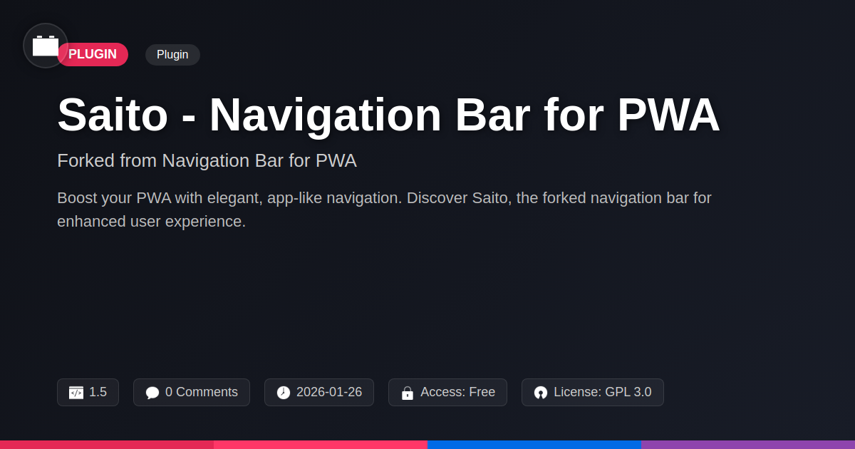 Tired of your web app looking like it was designed by a committee that only communicates through carrier pigeon? Do you dream of a navigation that feels as slick and intuitive as your favorite mobile application, but find yourself wrestling with clunky menus that belong in the digital stone age? Well, buckle up, buttercup, because we've got something that might just make your development life a whole lot less… beige. Introducing Saito - Navigation Bar for PWA, a fresh take on bringing that seamless, app-like navigation experience straight to your web projects. This isn't just another menu plugin; it's a meticulously crafted tool, forked from the solid foundations of the original Navigation Bar for PWA by Festinger Vault, but with its own destiny to forge. We understand the struggles – juggling development timelines, pleasing clients who want that specific look, and the constant quest for that elusive user experience that keeps people engaged. Saito is here to slash through some of that complexity, offering developers, agencies, and even the most ardent open-source aficionados a powerful, flexible, and downright good-looking solution for their navigation needs. Forget the days of Frankenstein-ing together a navigation system. It's time for something that just works, and frankly, looks pretty darn good doing it, without requiring you to sell your soul or sacrifice your firstborn child to the coding gods.