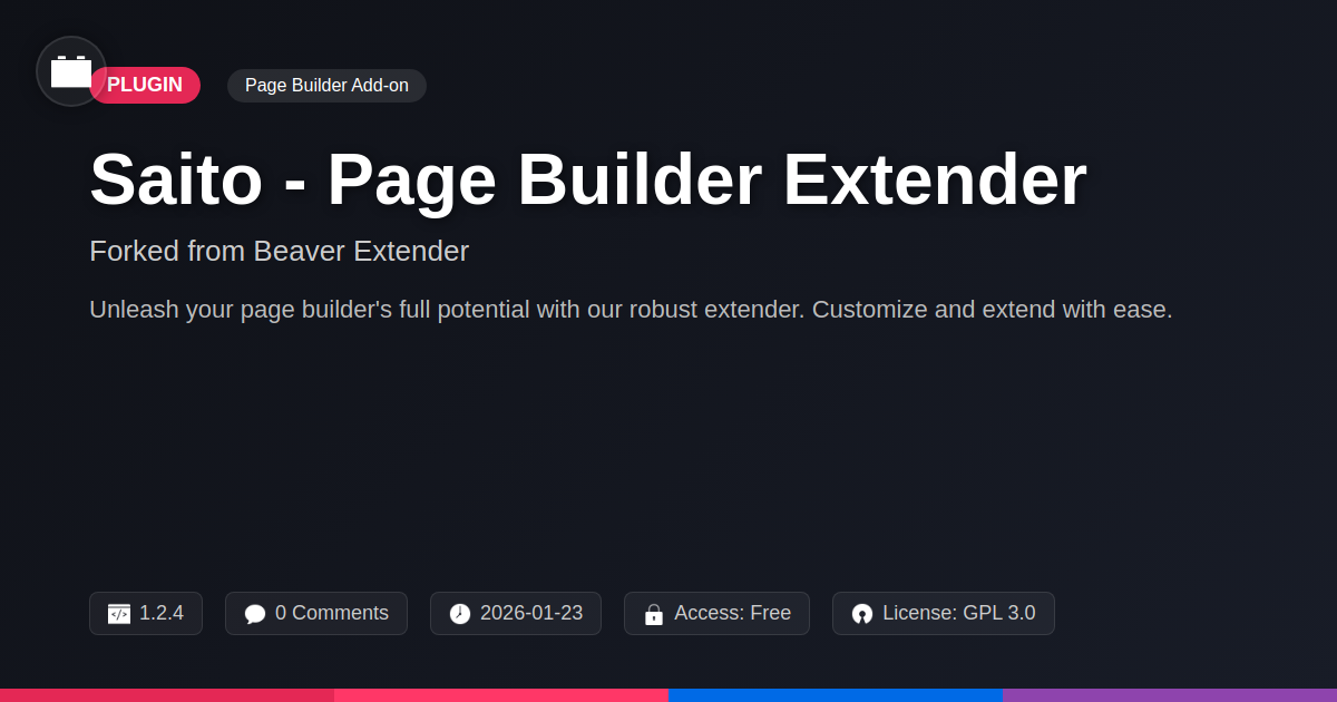 So, there you have it. You’re faced with a choice: continue fiddling with those clunky, restrictive builders that feel like trying to sculpt with a butter knife, or embrace a tool that actually respects your developer brain and agency needs. Saito - Page Builder Extender isn't just another plugin; it’s a liberation. It’s the digital equivalent of finally finding out the secret passage you never knew existed, bypassing all the annoying mazes and getting straight to the treasure. For the developers out there, it's the freedom to inject your genius without compromise. No more duct-taping solutions or praying that your custom code doesn't break with the next update. For the agencies wrangling multiple client projects, it's the sanity saver you didn't know you were missing. Imagine delivering truly unique, high-performing sites, consistently, without reinventing the wheel every single time. And for the staunch advocates of open-source, this is a testament to what happens when good tools are nurtured and extended with community spirit. It’s about collaboration, innovation, and keeping the power where it belongs: with you. This extender doesn't just add features; it enhances your entire workflow, making the complex manageable and the mundane… well, less mundane. It’s time to stop asking 'can I?' and start confidently building 'I will.'