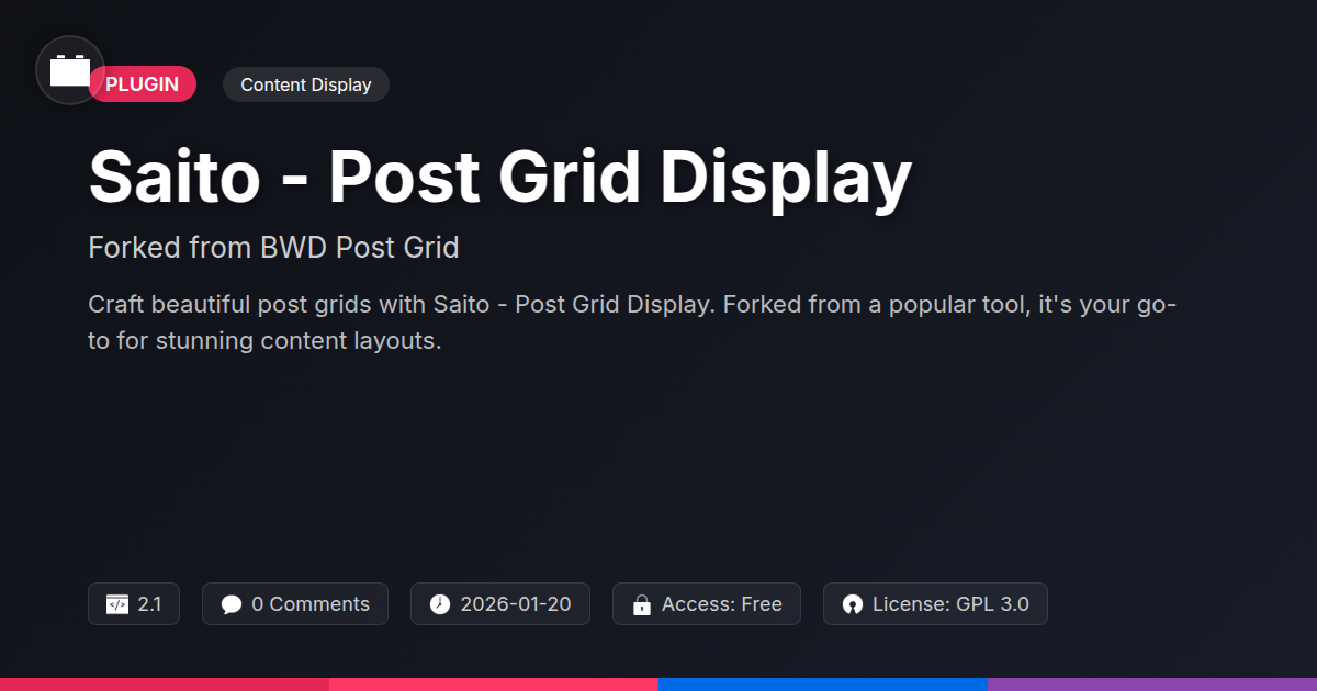 But what if there was a tool that stripped away the complexity, offering you a powerful, yet intuitive, way to create stunning post grids? A solution that felt like it was built by people who actually use these platforms? Imagine effortlessly crafting beautiful layouts, customizing every detail, and ensuring your content gets the spotlight it deserves, all without needing a degree in arcane digital arts. This is where Saito - Post Grid Display steps in, forking a beloved tool, and aiming to make your content display dreams a reality, with a dash of developer-friendly flair and a healthy dose of sanity preservation.