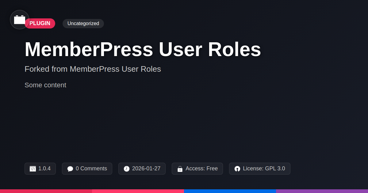 GrootMade is NOT affiliated with MemberPress User Roles or its original author. MemberPress User Roles™ is a trademark of its respective owner and use of it does not imply any endorsement or affiliation. This product has been forked under the GNU General Public License (GPL) and all non-GPL assets (such as proprietary images, fonts, and branding) have been removed. Distributing GPL-licensed code is 100% legal.